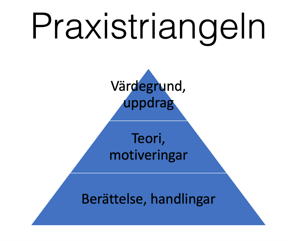 Med praxistriangeln tar vi istället ett steg upp och kopplar berättelsen till begrepp, teorier och perspektiv utifrån olika kompetenser och professioner. Vi tjafsar inte utan anstränger oss för att lyfta olika perspektiv så att vi förstår att man kan se det hela på fler sätt än ett sätt. Här kopplar vi alltså på forskning och erkänner att det kan finnas olika typer av forskning utifrån olika typer av perspektiv som alla måste beaktas.